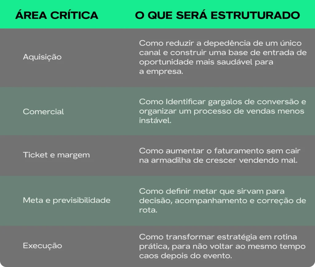Mas empresa não cresce de forma previsível porque “aparece mais”. Ela cresce de forma previsível quando tem canal de aquisição com lógica, processo comercial com conversão, margem protegida, meta clara e execução organizada.