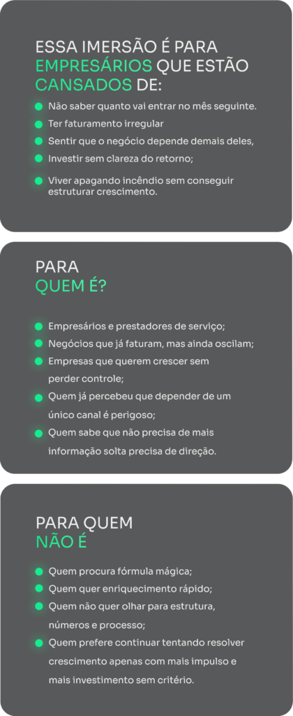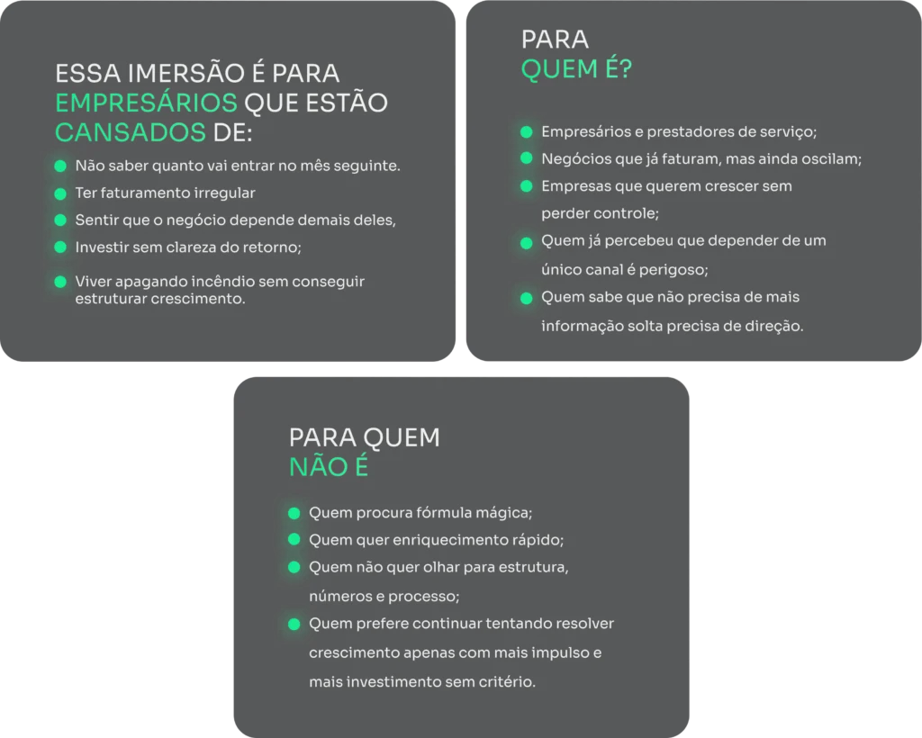 Ao final da imersão, você terá clareza sobre como parar de depender de apenas uma fonte de clientes, o que ajustar para vender com mais margem, onde estão os vazamentos que impedem crescimento, como criar uma estrutura comercial mais previsível e quais decisões precisam ser tomadas para sua empresa operar em direção aos 100 mil mensais com mais segurança.